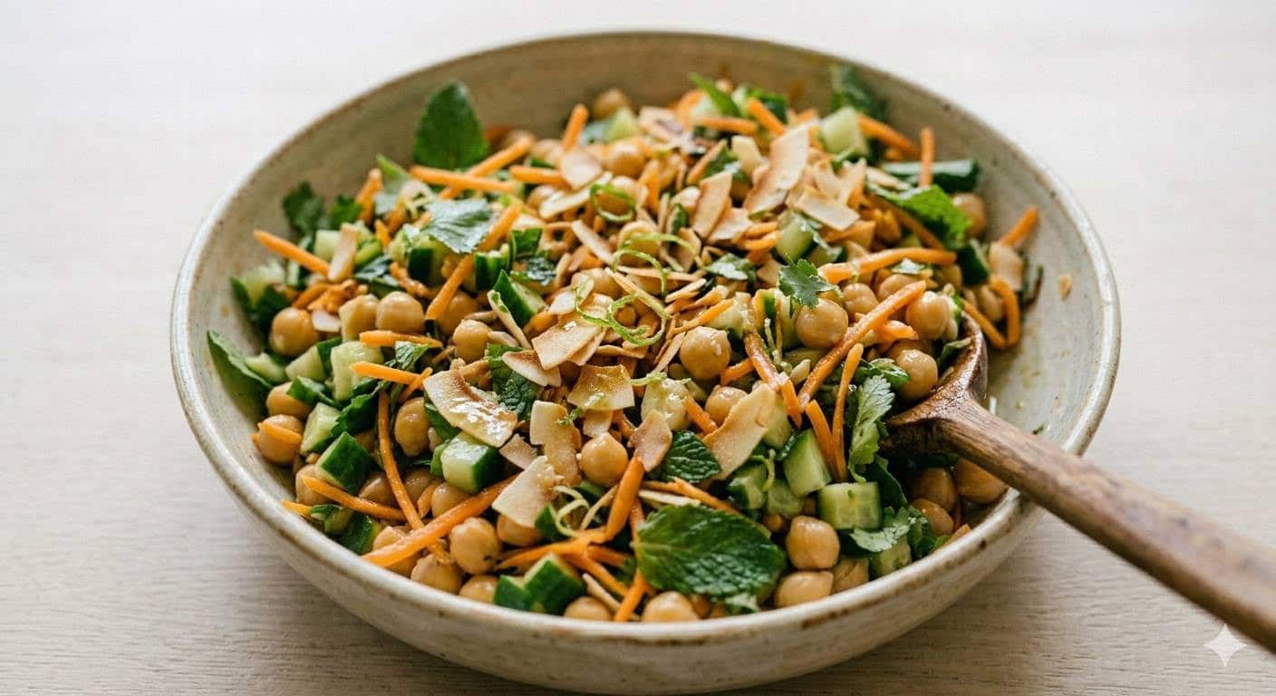 Ingredients: chickpeas, lemongrass, cucumbers, mint, cilantro (optional), shredded carrots, celery, and toasted coconut (optional), lime, herbs and spices.