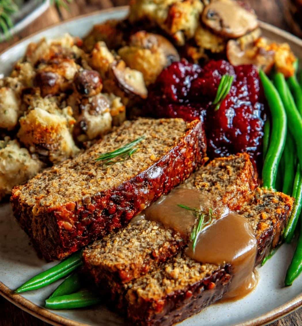 Option 1 – Lentil loaf with mushroom gluten-free stuffing, gravy, crancherry sauce and lemon/garlic green beans.