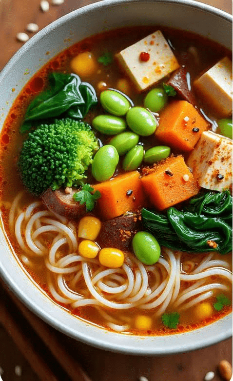 Ingredients: Rice noodles, broccoli, sweet potato, organic tofu, organic corn, bok choy, edamame, black pepper, miso, veggie broth.