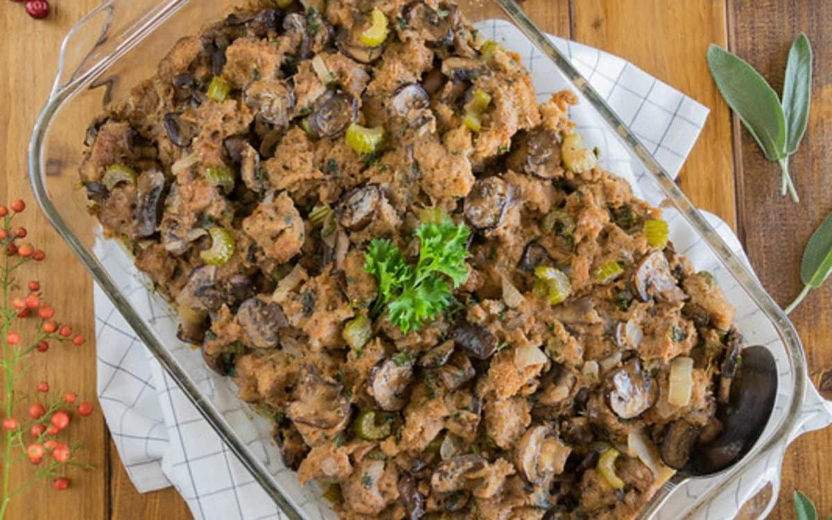 Ingredients – gluten-free bread, mushrooms, onions, garlic, thyme, stock.